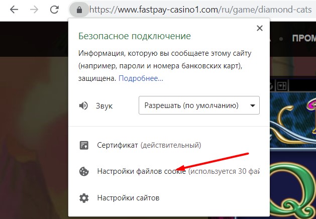 В браузерах есть возможность просмотра кода страницы или конкретного элемента (онлайн-слота), а также другие способы просмотра сведений о сайте казино. На примере хрома самый простой способ выглядит так: например, открываем сайт казино FastPay, выбираем слот «Diamod Cats» от Amatic и нажимаем на «замочек» рядом с адресной строкой: