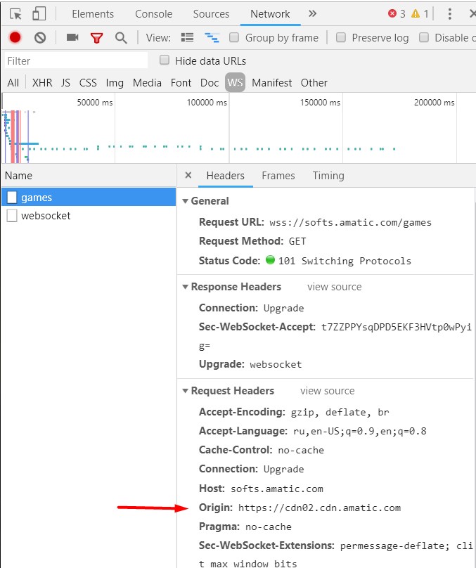Есть более сложный способ, который работает через просмотр кода страницы (или элемента). В хроме нажимаем f12, откроется меню, в котором нужно перейти на вкладку «Network». Здесь можно просмотреть все запросы на сервер и ответы от него. Примечание: слоты amatic работают через веб-сокеты (ws), поэтому, чтобы увидеть сервер нужно выбрать пункт «WS»: