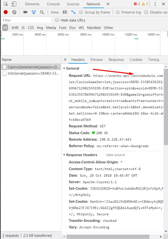 Способ через просмотр кода (f12): здесь нужно выбрать пункт «All» и сделать спин. В списке появится событие с URL, содержащим адрес сервера Netent (*.casinomodule.com).