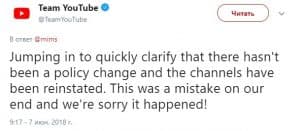 Вчера официальный твиттер ютуба в ответ на зарубежную статью о том как банят стримеров написал: «Jumping in to quickly clarify that there hasn’t been a policy change and the channels have been reinstated. This was a mistake on our end and we’re sorry it happened!»