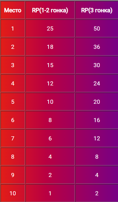 • Кроме SP в гонке есть рейтинговые баллы (RP), которые начисляются в конце каждой части гонки. Количество RP зависит от места в таблице