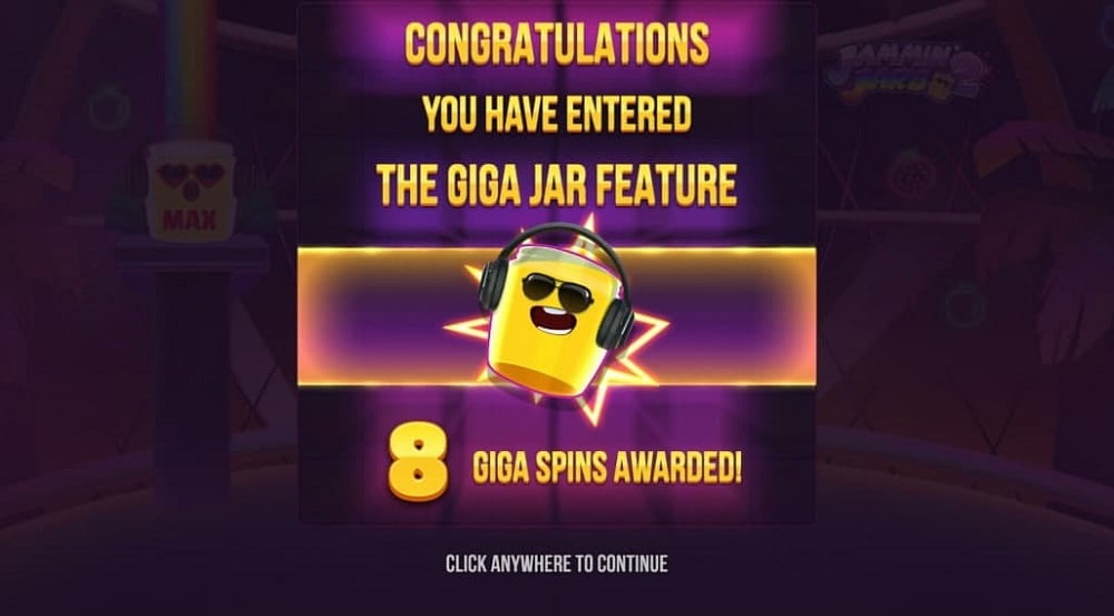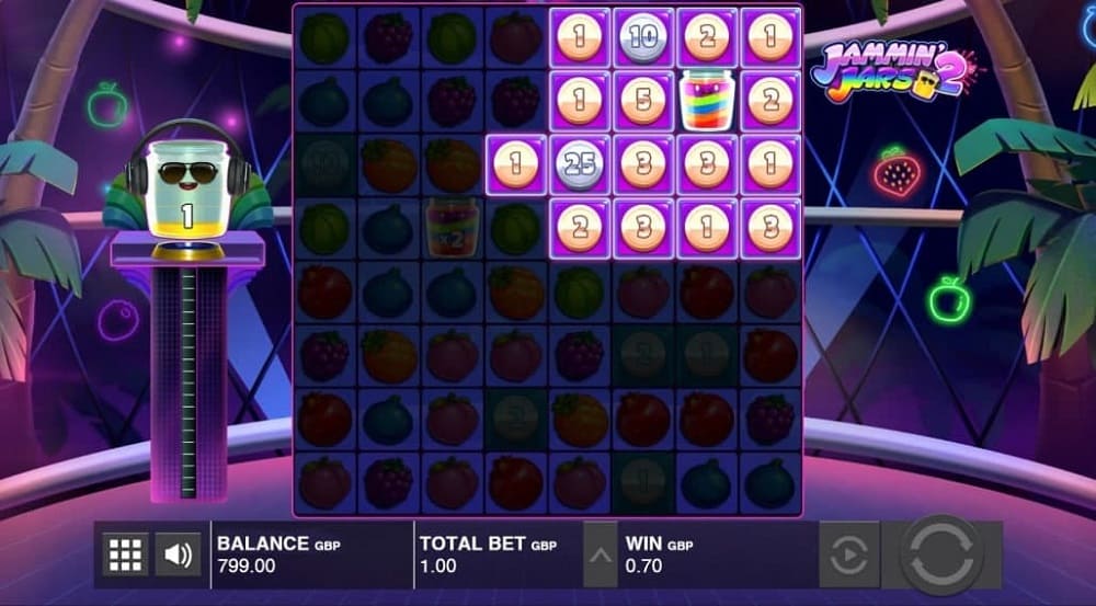 Максимальный выигрыш стал больше в 2 раза, чем в первой части. А новая функция Giga Jar активируется при заполнении шкалы, которая состоит из 5 уровней. Для этого нужно «ловить» золотые пластинки на игровом поле. Также, в любой момент может произойти запуск красочной функции Fruity Blast!