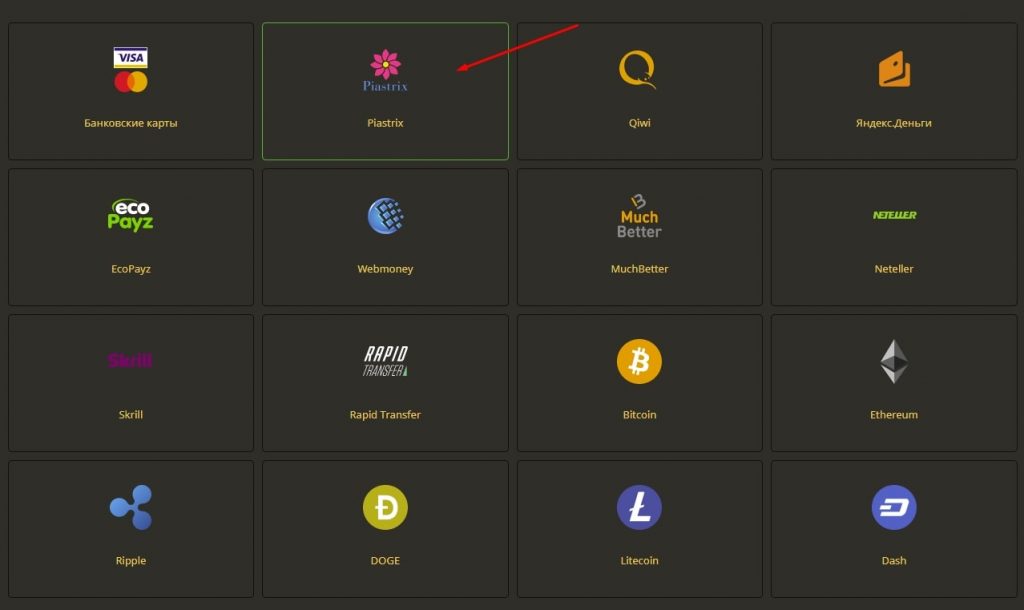 1) Открываем кассу на сайте казино и выбираем метод Piastrix: