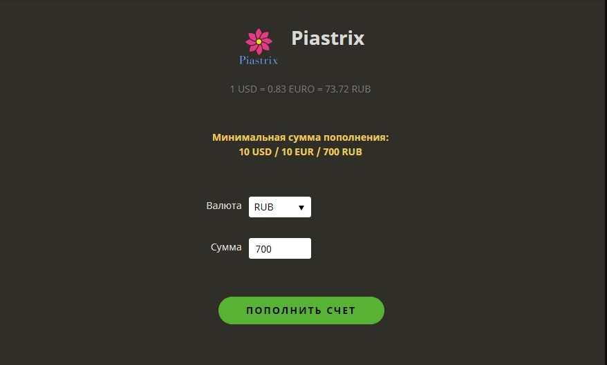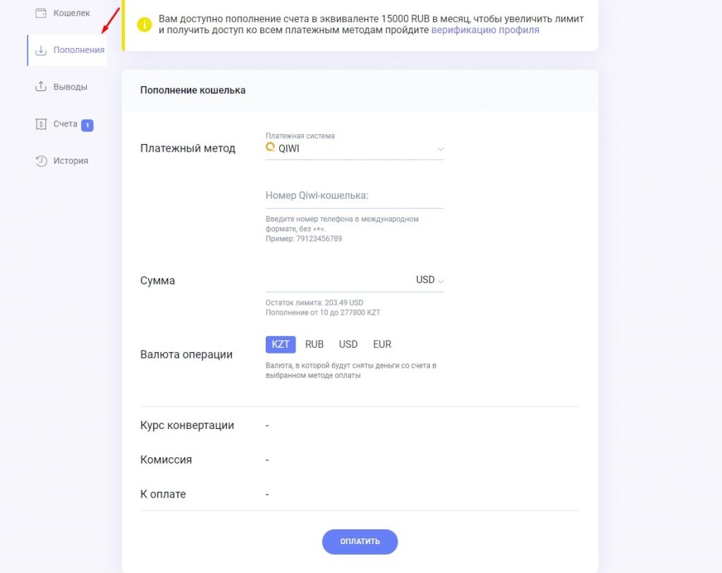 10) Для его оплаты нужно пополнить кошелёк Piastrix, перейдя в раздел «Пополнения». Здесь просто выбираем валюту, указываем свой Qiwi-кошелёк и нажимаем «Оплатить»: