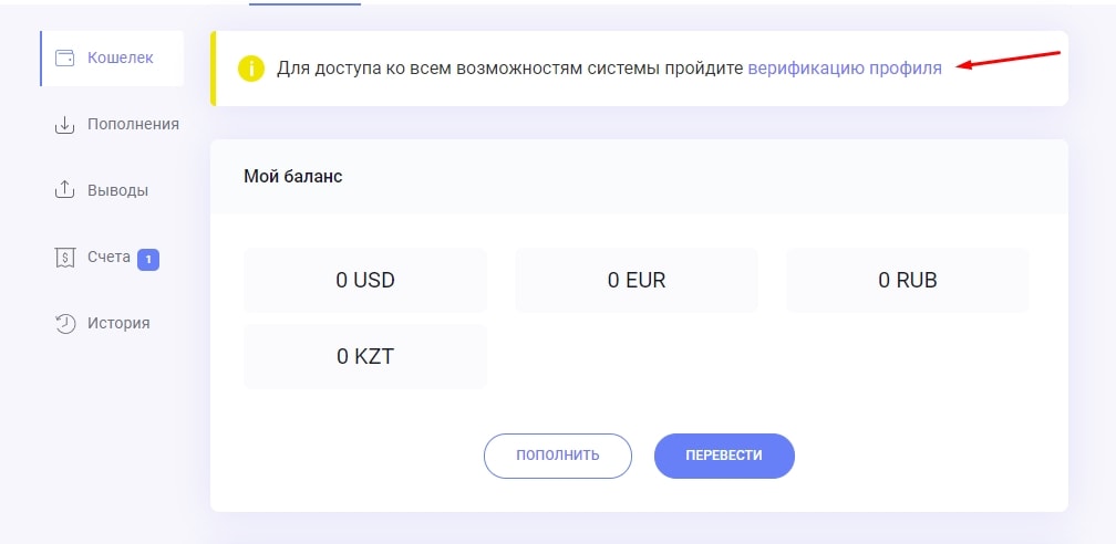 6) Входим в кошелёк и проходим верификацию, чтобы снять лимиты и комиссию, а также получить возможность делать выводы: