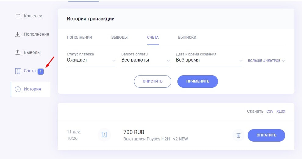 11) Далее возвращаемся на вкладку «Счета» и оплачиваем выставленный счёт. Деньги в считанные секунды приходят на Ваш баланс в казино.