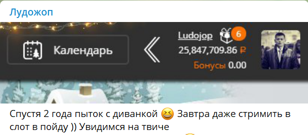 Судя по всему, выигрыш произошёл в оффлайне. Поэтому у нас нет ни видео, ни скринов заноса. Всё, что есть на данный момент, картинка с балансом, которую Лудожоп опубликовал в своей телеге: