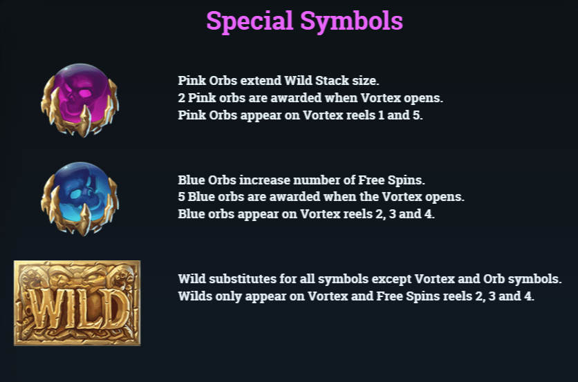 Особые символы представлены в виде вилдов и шаров с черепами. Wilds умеют заменять другие базовые символы и появляются только в бонусных режимах. Черепа бывают 2-х видов: розовые и голубые. Их нужно копить, для того, чтобы в игре с фриспинами увеличить количество FS и Wild. Розовые черепа отвечают за количество Wild, а голубые — за фриспины. По умолчанию при начале игровой сессии у вас будет 2 черепа с вилдами и 5 с фриспинами.