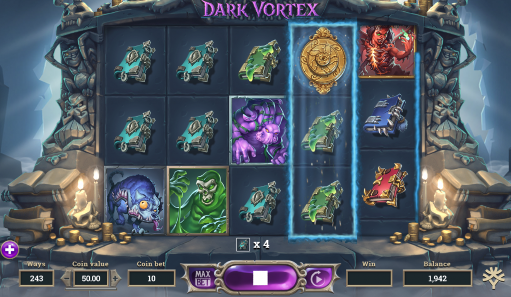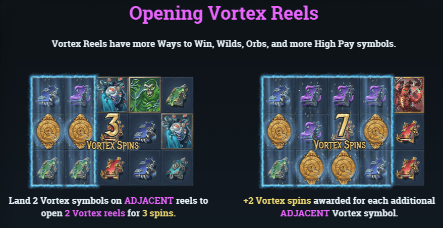 Здесь вас ждут оригинальные бонусные функции, несколько способов запуска фриспинов, крутая графика и качественное звуковое соповождение! Также в Dark Vortex можно в любой момент купить бонусную игру с фриспинами! Схема слота может меняться. Например, в бонусной игре поле может расшириться по вертикали до 5 рядов, схема изменится с 5*3 до 5*5. Что повлечет за собой и увеличении линий. Количество линий колеблется в диапазоне от 243 до 3125. Максимальный выигрыш составляет около x7000 от максимальной ставки.