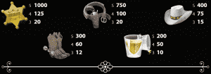 Символы соответствуют тематике вестернов: звездочка шерифа, бокал выпивки, револьвер… Таблицы выплат приведены на картинках ниже.