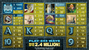 Символы представлены c использованием скандинавской мифологии: изображения богов, молот Тора, город Асгард, базовые и специальные символы. Выпадая на барабанах, они будут образовывать комбинации, имеющие разную стоимость. На рисунке ниже представлены таблицы выплат.
