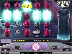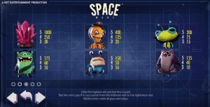 Привычной всем бонусной игры и бесплатных вращений в этом автомате нет! Зато есть функция Re-spin! При каждой выигрышной комбинации запускается повторное вращение: символы, участвующие в комбинации, отправляются в космический аппарат по размножению (находится справа) и разбрасываются случайным образом по игровым клеткам! Вероятность заполнения всего поля этими символами при Re-Spin очень большая!